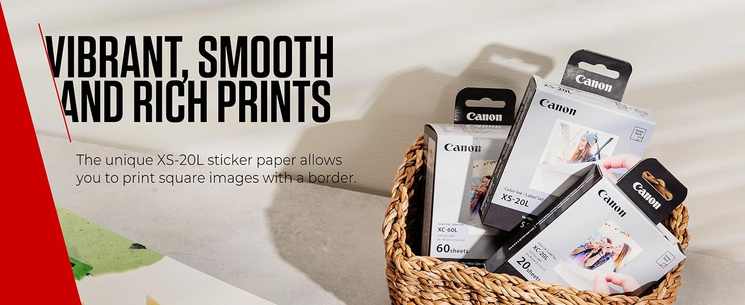 The Canon Color Ink/Label Set XS-20L includes 20 sheets of high-quality ink designed for the Selphy Square Printer, producing vibrant prints that last up to 100 years. Perfectly sized for social media sharing and scrapbooking, these prints feature a thicker edge for easy writing and a protective layer that resists water and spills, making them ideal for any occasion.