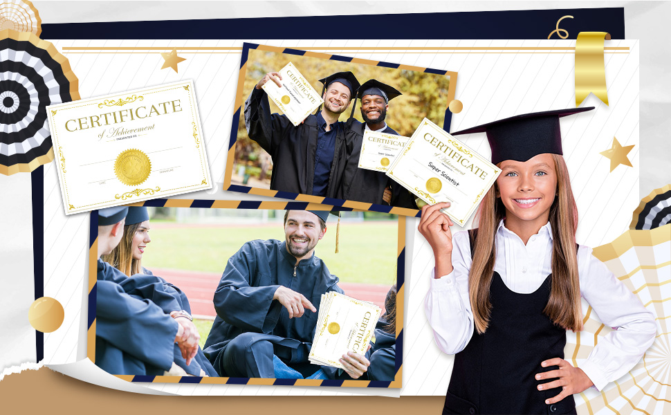 The Seajan 50 Packs Gold Foiled Certificate Paper set includes 50 high-quality certificate sheets and 100 embossed gold foil seals, designed for professional printing and suitable for various award ceremonies and recognitions. Each sheet measures 11 x 8.5 inches, ensuring compatibility with standard printers, while the durable paper and elegant seals make every achievement feel special.