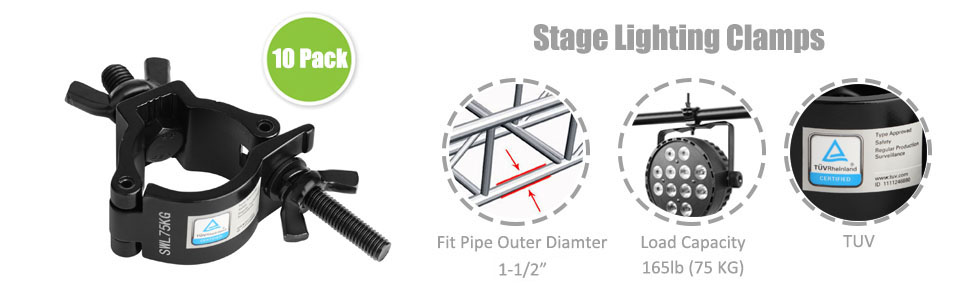 This 10-pack of 1-1/2" OD stage lighting clamps features a quick-lock single-button design, crafted from durable 6061 aluminum alloy with sandblasted oxidation. Each clamp supports up to 165 lbs (75 kg) and fits standard 1-1/2" truss pipes, making them ideal for secure, fast, and reliable mounting of stage lights, spotlights, and moving heads. TUV certified for professional-grade safety and performance.