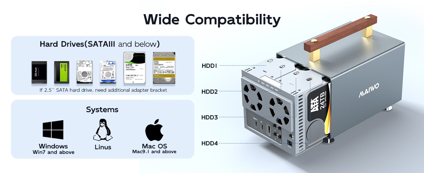 The MAIWO 4-Bay Hard Drive Enclosure is a professional-grade external storage solution featuring SATA III chipset and USB 3.2 Gen2 for blazing 10Gbps transfer speeds. It supports up to 96TB total capacity across four 3.5-inch SATA HDD bays, with independent power switches for each drive. Crafted from aluminum alloy with dual cooling fans, it ensures optimal heat dissipation. Additional features include daisy chain support, 4K HDTV compatibility, and a compact, portable design with a removable handle, making it ideal for demanding multitasking environments across Windows, Mac, and Linux platforms.