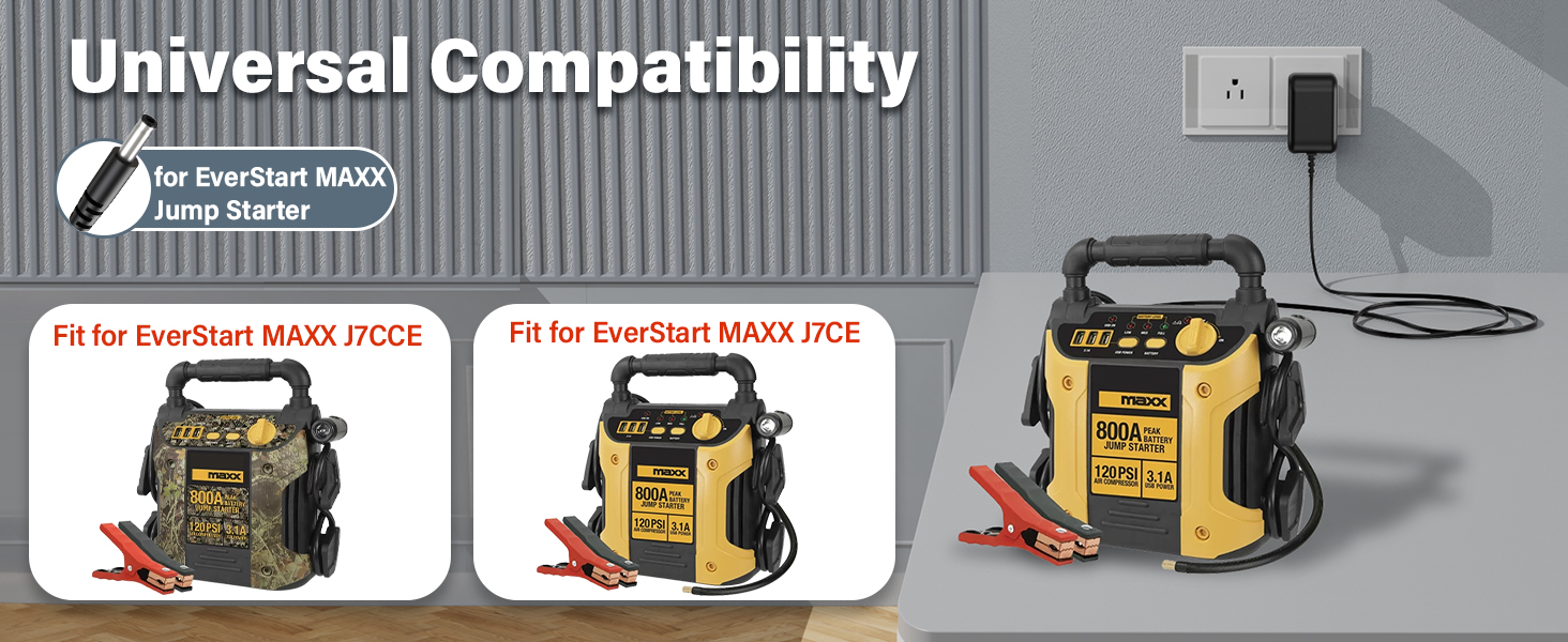 12V for EverStart J7CCE Maxx Charger Power Cord Adapter for EverStart J7CCE J7CE 800 Peak Amp 800A Battery Car Camo Jump Starter Ever Start Max with 120 PSI Compressor 3.1A USB Power