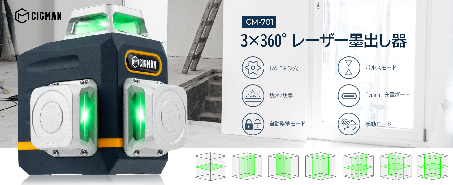 The CIGMAN CM701 Laser Marker delivers professional-grade 3x360° green laser lines visible up to 30 meters, featuring a magnetic rotating stand, remote control, and Type-C rechargeable battery. Its self-leveling and manual modes provide versatile, precise alignment for any workspace, making it an essential tool for millennial managers demanding efficiency and accuracy.